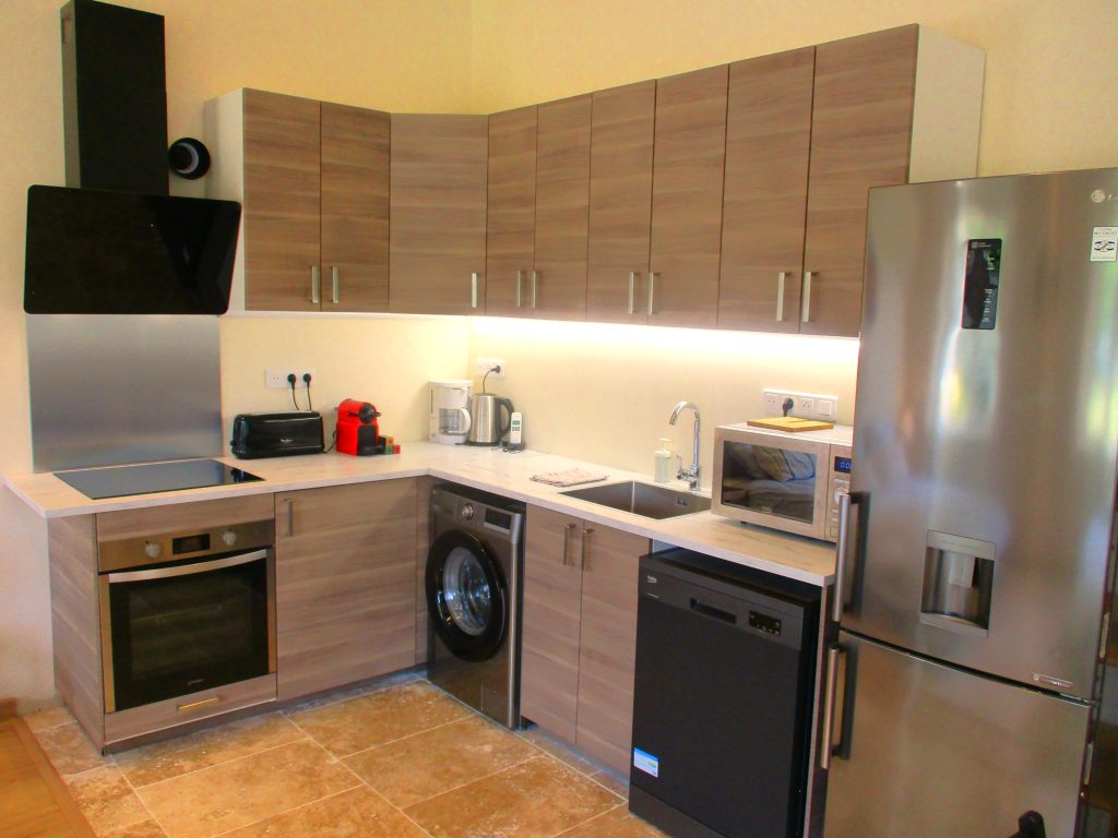 - in der Küche ein Esstisch, 4 Stühlen, Beko-Spülmaschine, Ariston-Induktionsplatte, Ariston-Backofen, Nespresso-Kaffemaschine (mit Kapseln), LG-Kühlschrank und Gefrierfach, Samsung-Mikrowelle und Samsung-Waschmascine